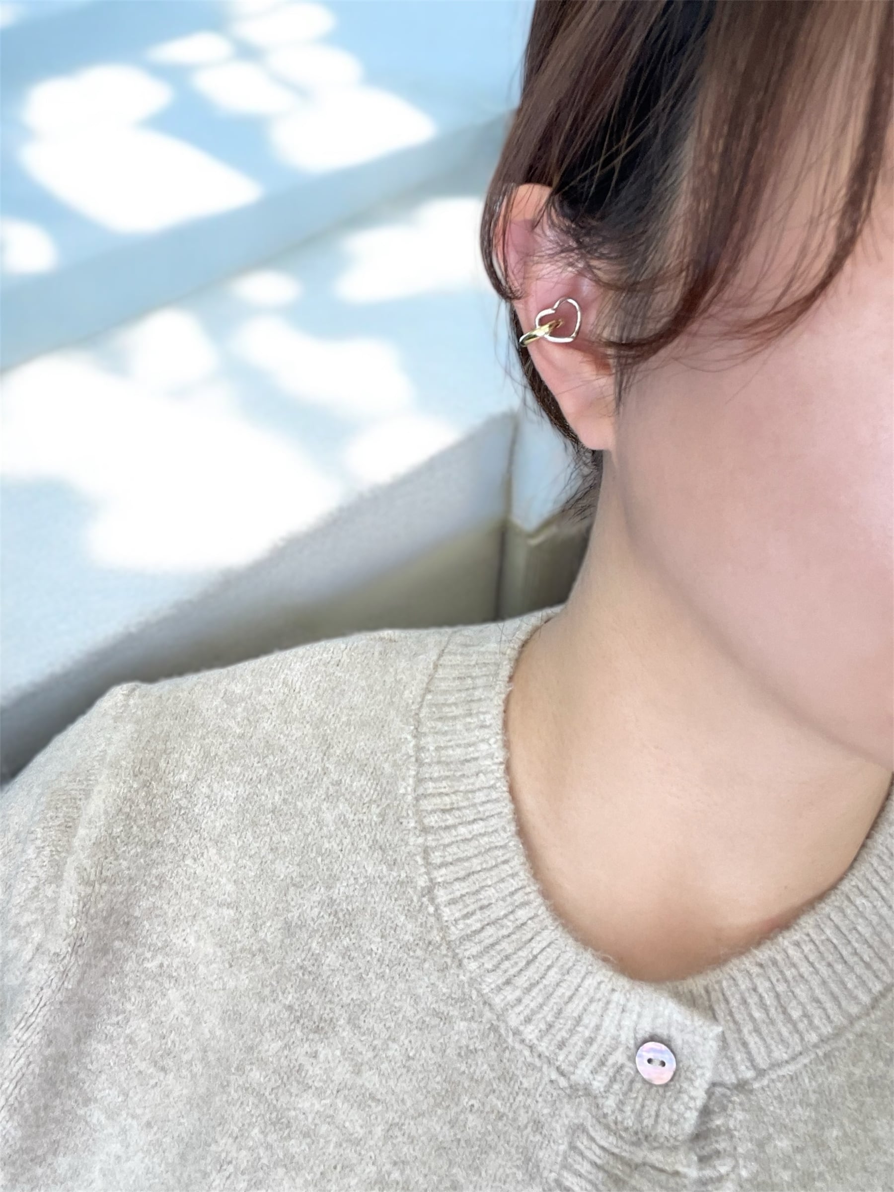 バイカラーのハートが付いたイヤーカフです(ハート部分は固定されており動きません)
